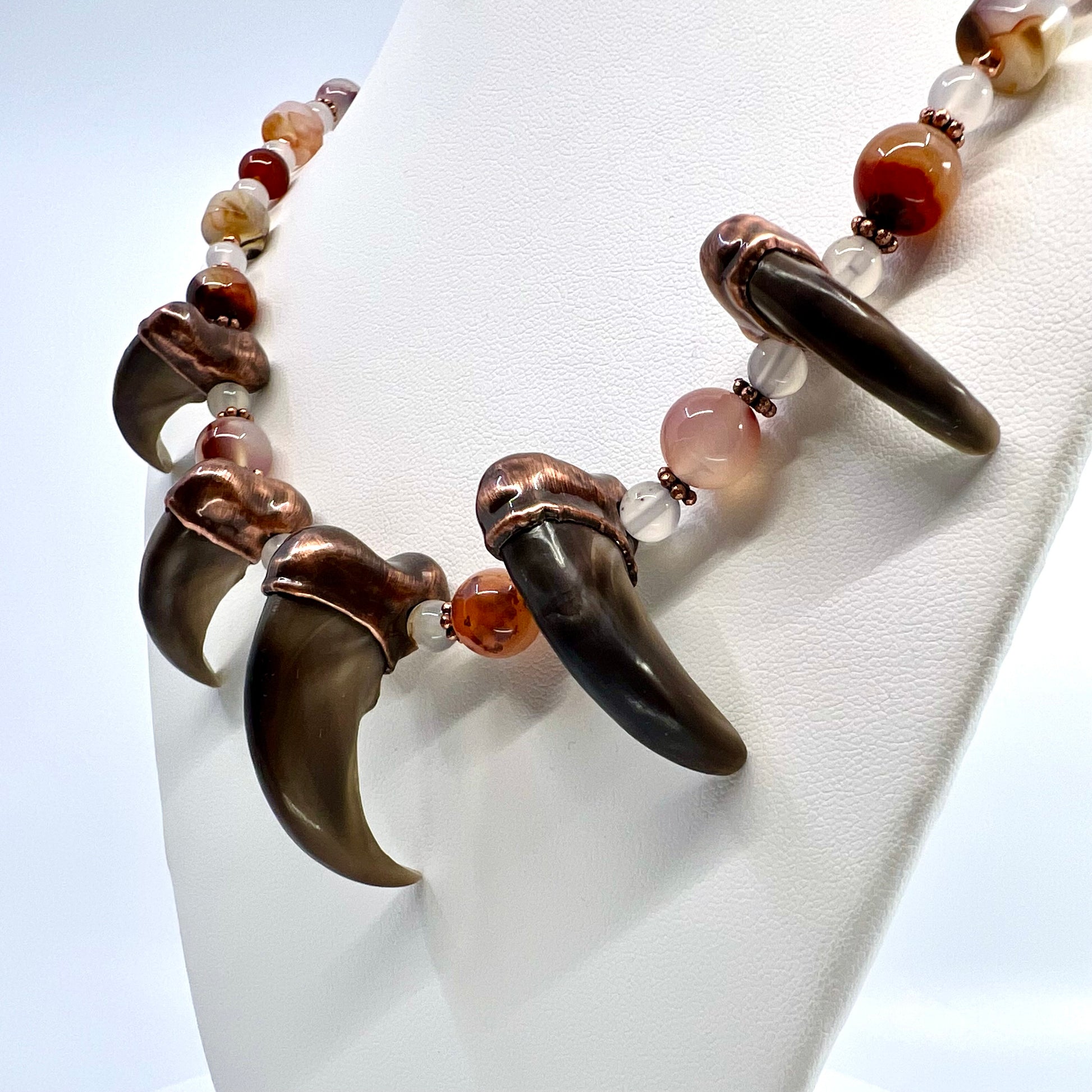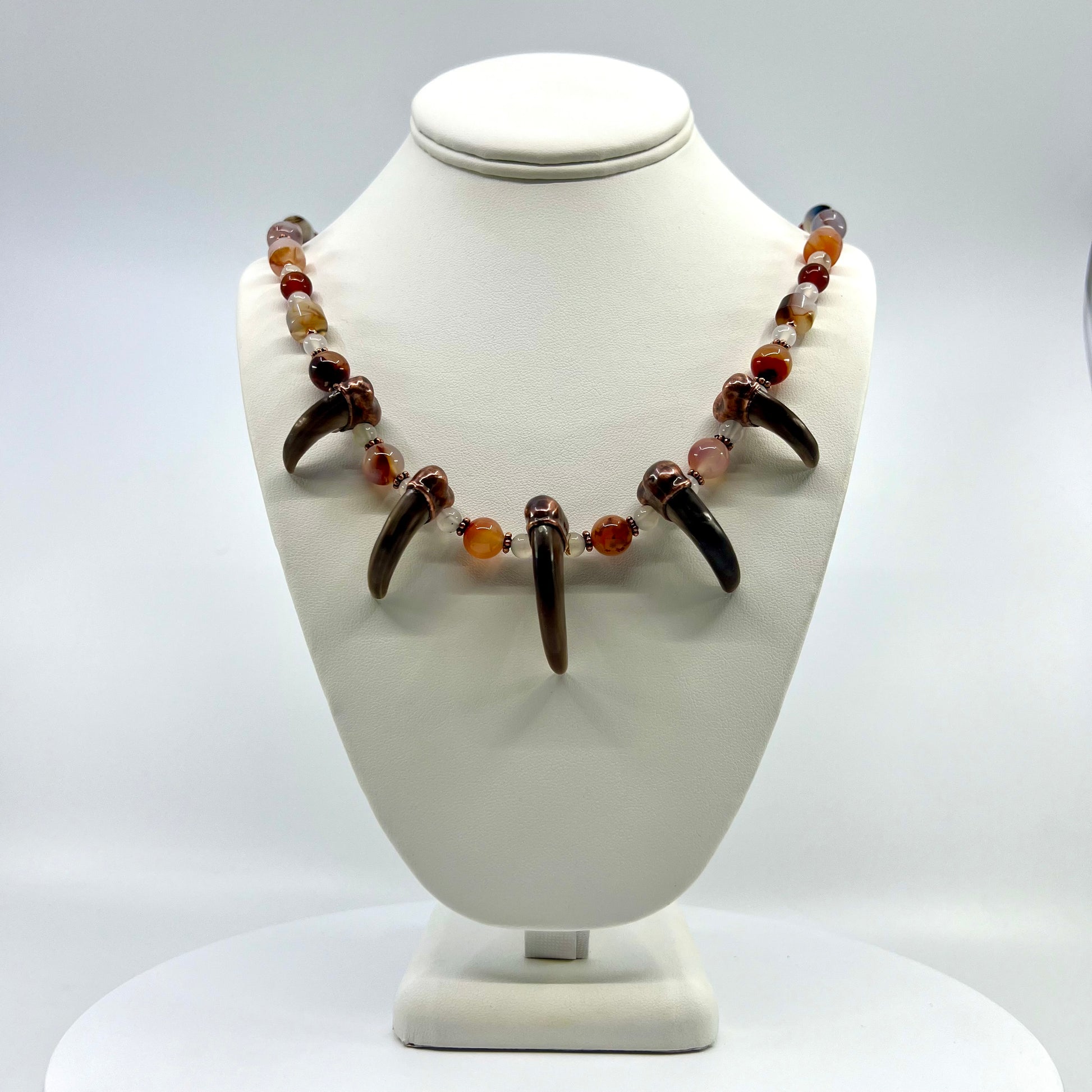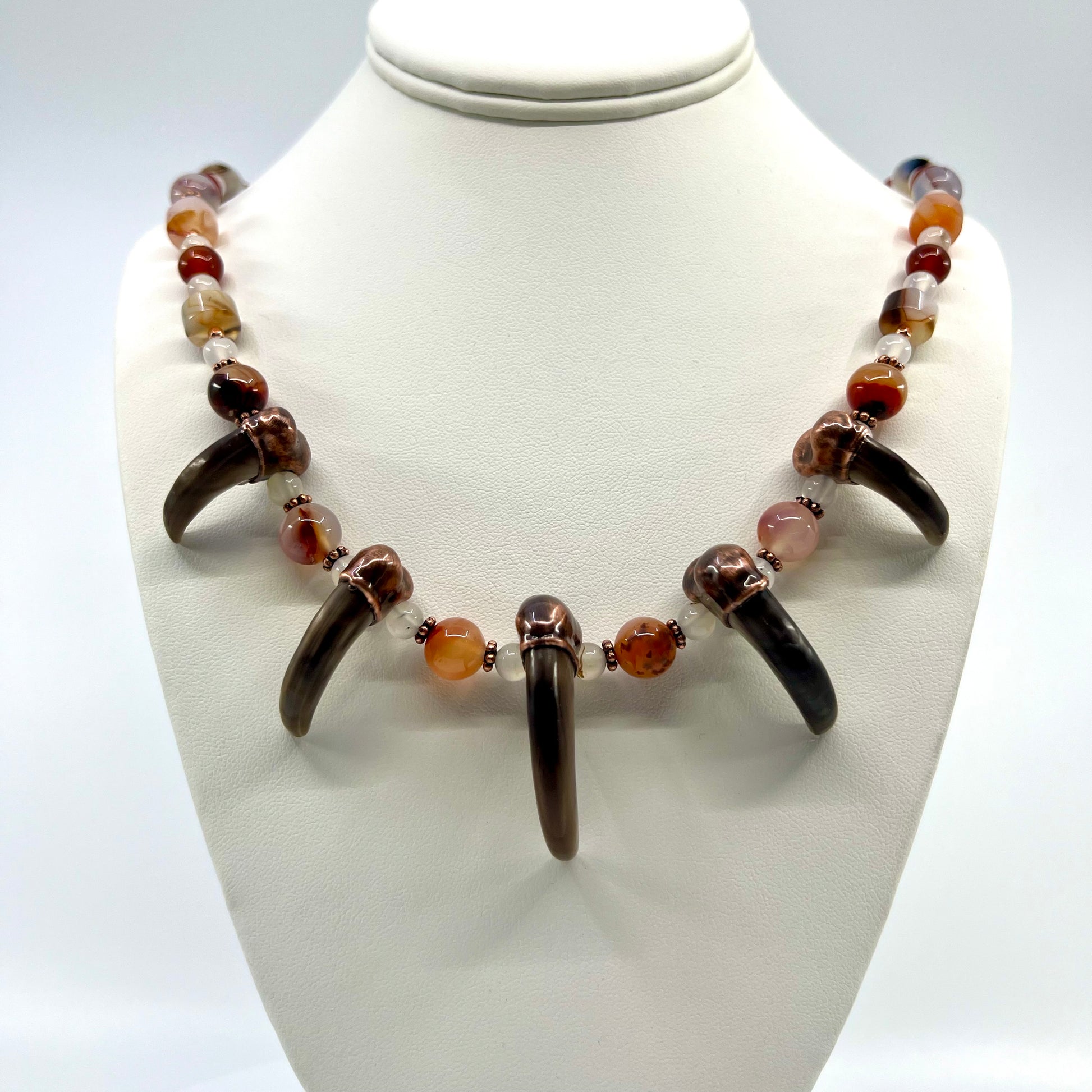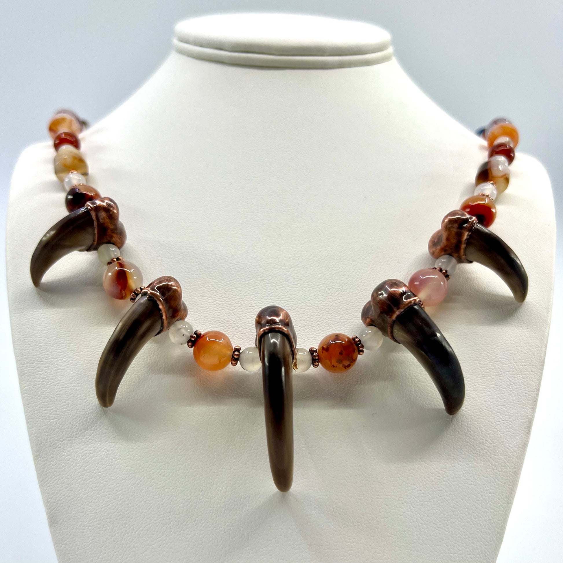 5 copper electroformed bear claws sit on a strand of Montana red dendritic agate (also known as flower agate), carnelian, and copper beads. The claws are not stationary but rather move freely and sit on the chest in a paw like structure. This necklace is intended as a display piece primarily and to be worn on special occasions rather than everyday wear. The 5 claws really emphasize the magnificence of bears and what they are capable of with the swipe of a paw! I find that displaying the claws as a necklace has a different aesthetic to having a hide display with the paws intact as this presentation makes the polished claws the focal point and is more palatable for those who aren’t as accustomed to taxidermy. The necklace is 23 inches long and features an s-hook style clasp. The white leatherette display bust is included.