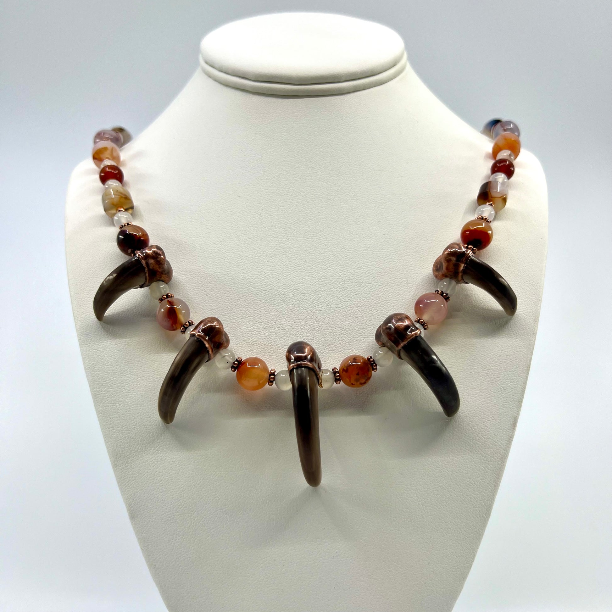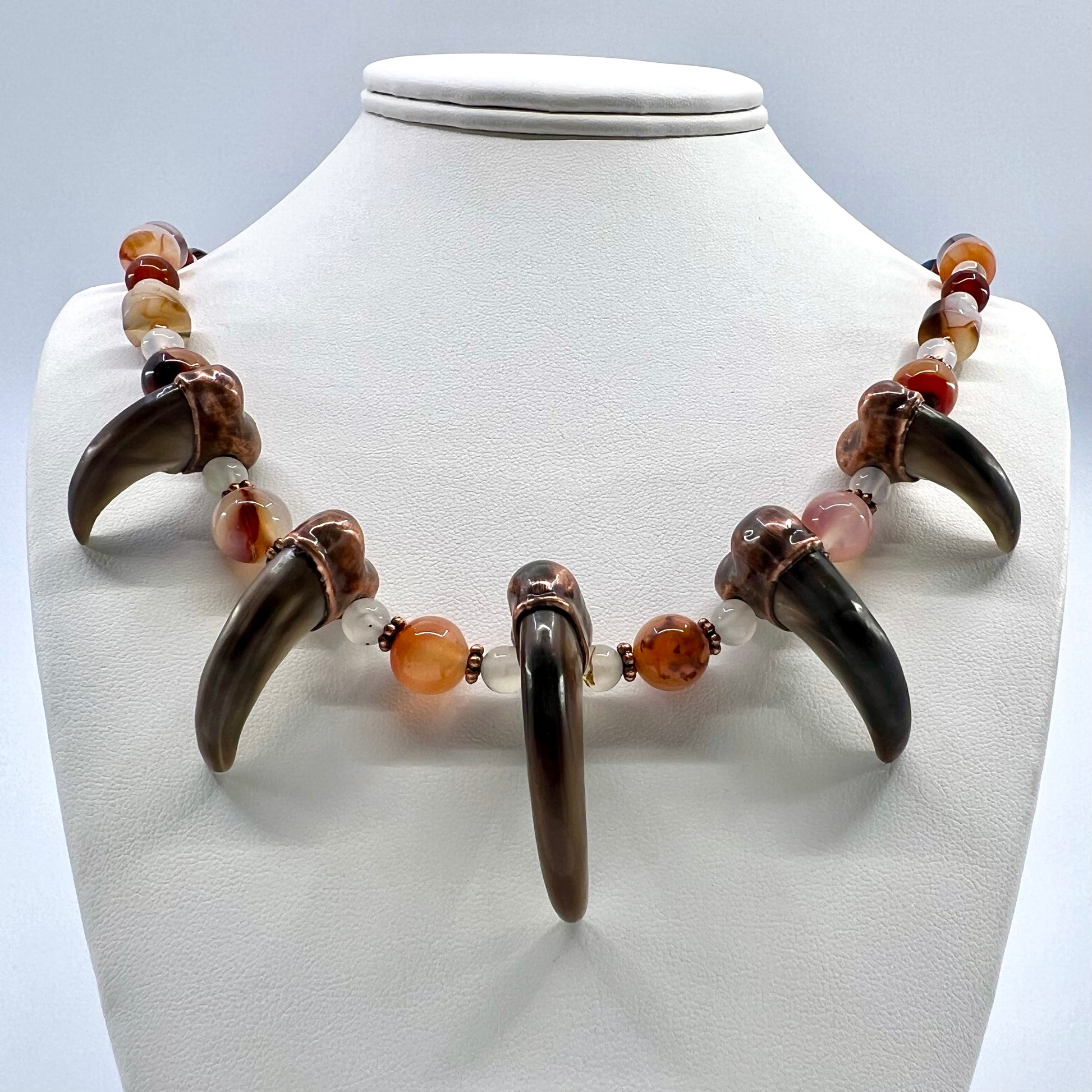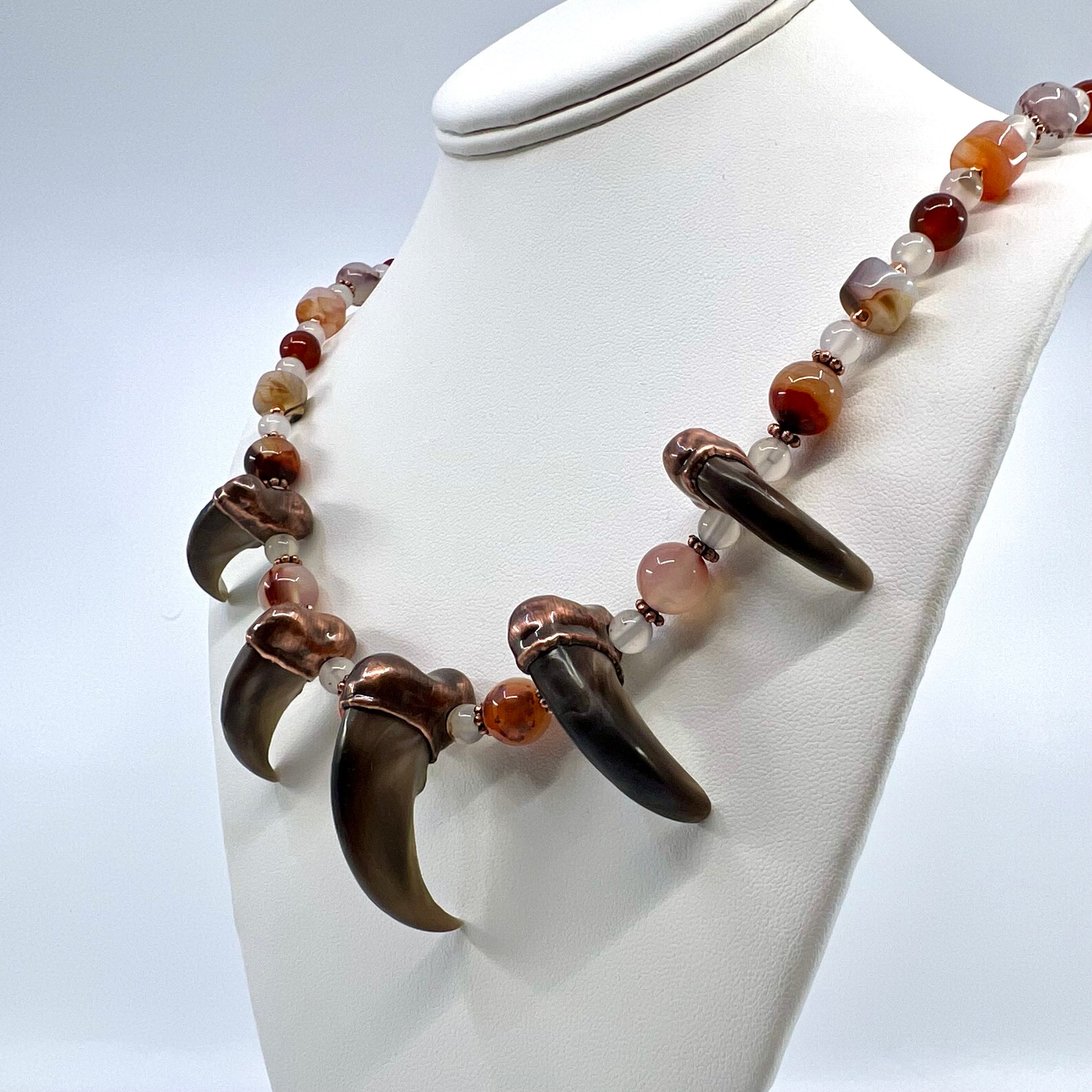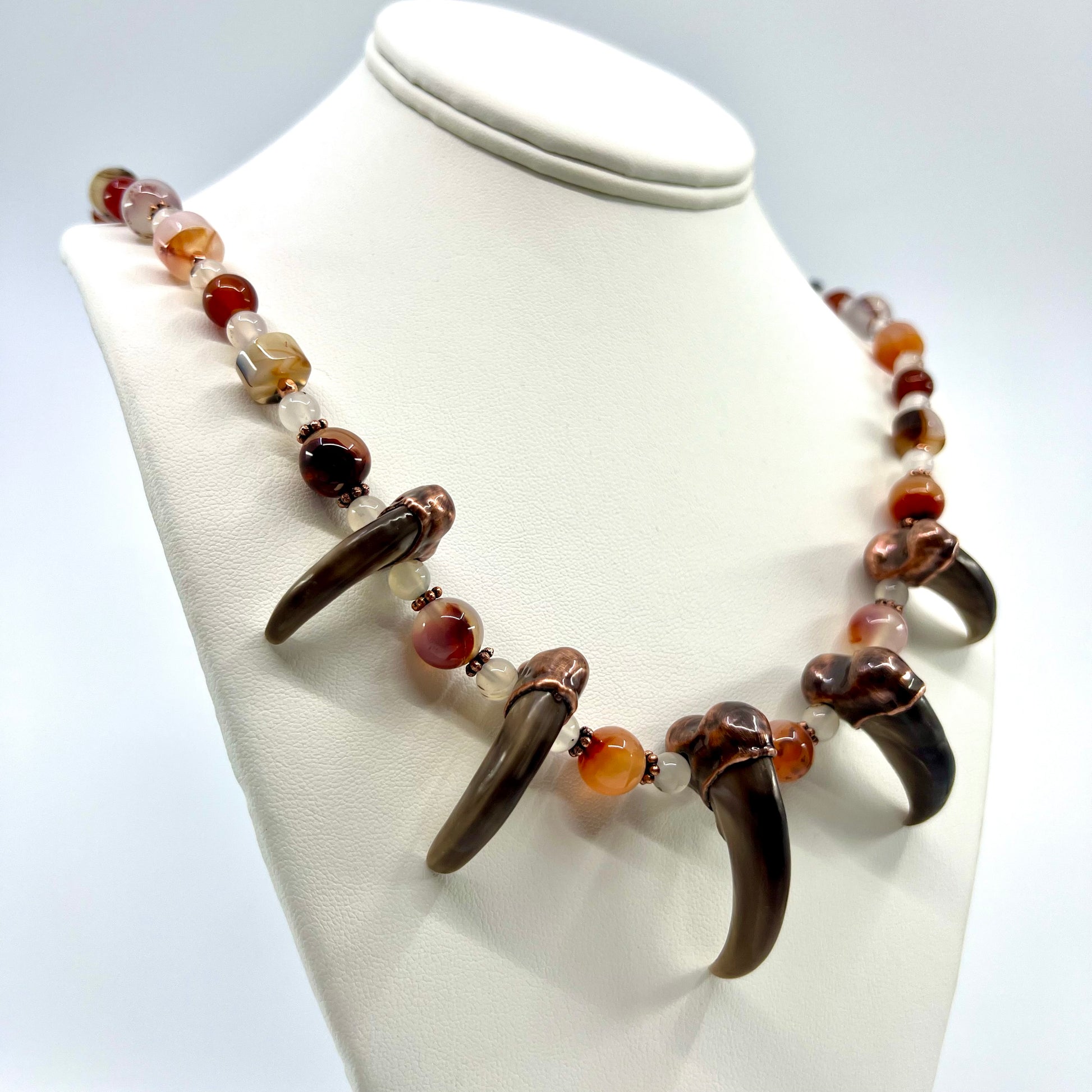 5 copper electroformed bear claws sit on a strand of Montana red dendritic agate (also known as flower agate), carnelian, and copper beads. The claws are not stationary but rather move freely and sit on the chest in a paw like structure. This necklace is intended as a display piece primarily and to be worn on special occasions rather than everyday wear. The 5 claws really emphasize the magnificence of bears and what they are capable of with the swipe of a paw! I find that displaying the claws as a necklace has a different aesthetic to having a hide display with the paws intact as this presentation makes the polished claws the focal point and is more palatable for those who aren’t as accustomed to taxidermy. The necklace is 23 inches long and features an s-hook style clasp. The white leatherette display bust is included.