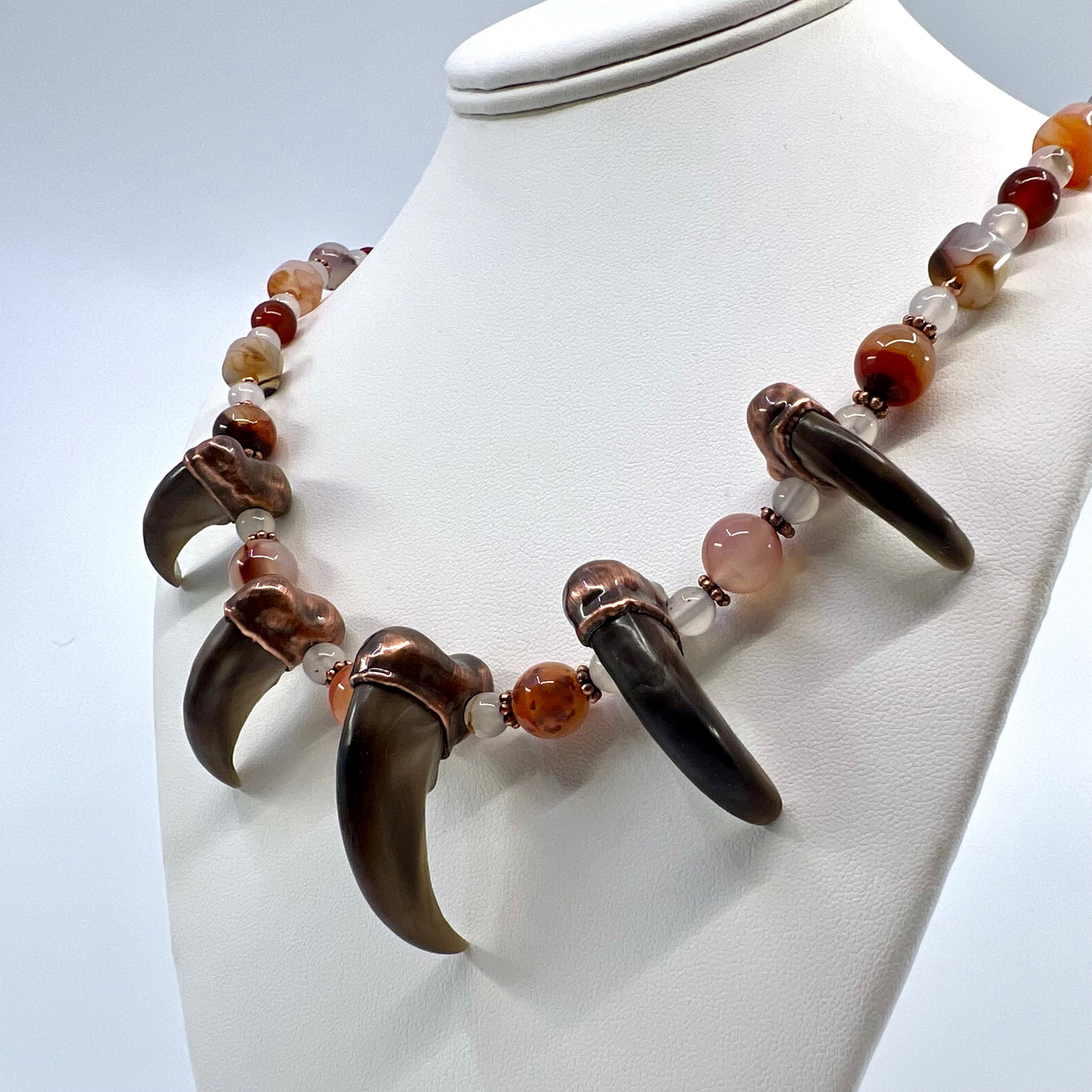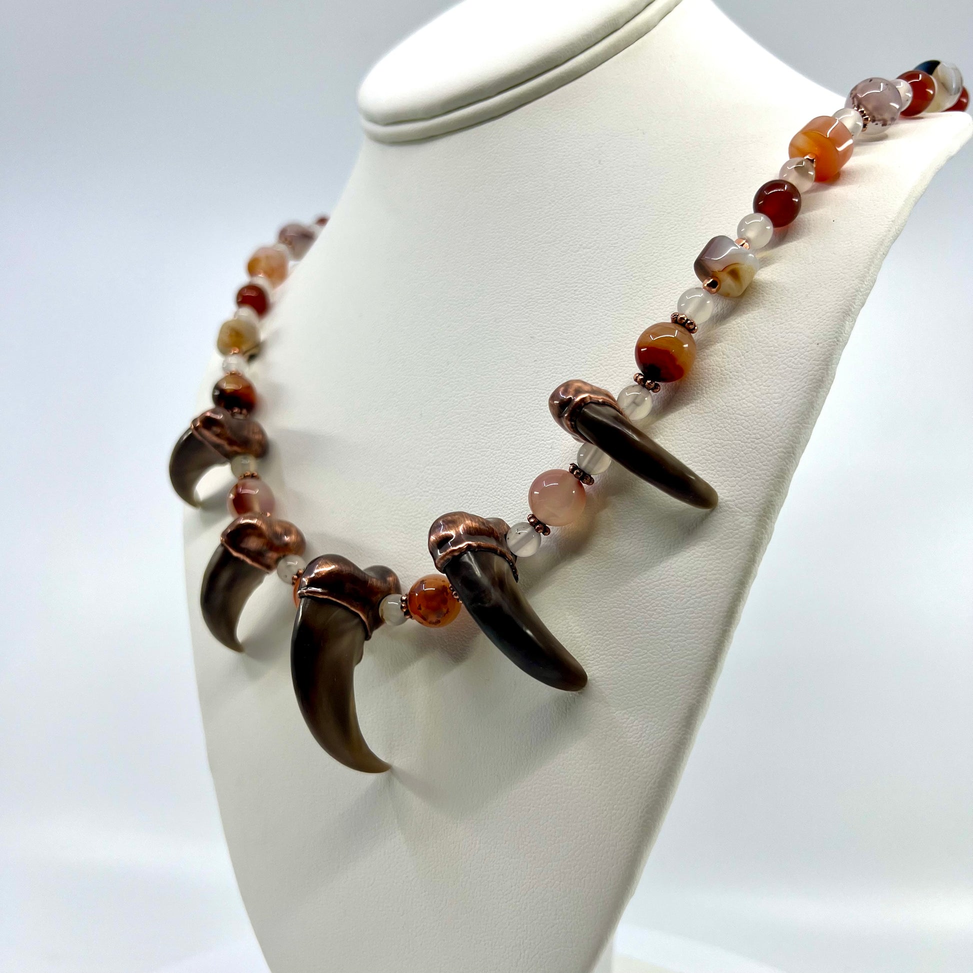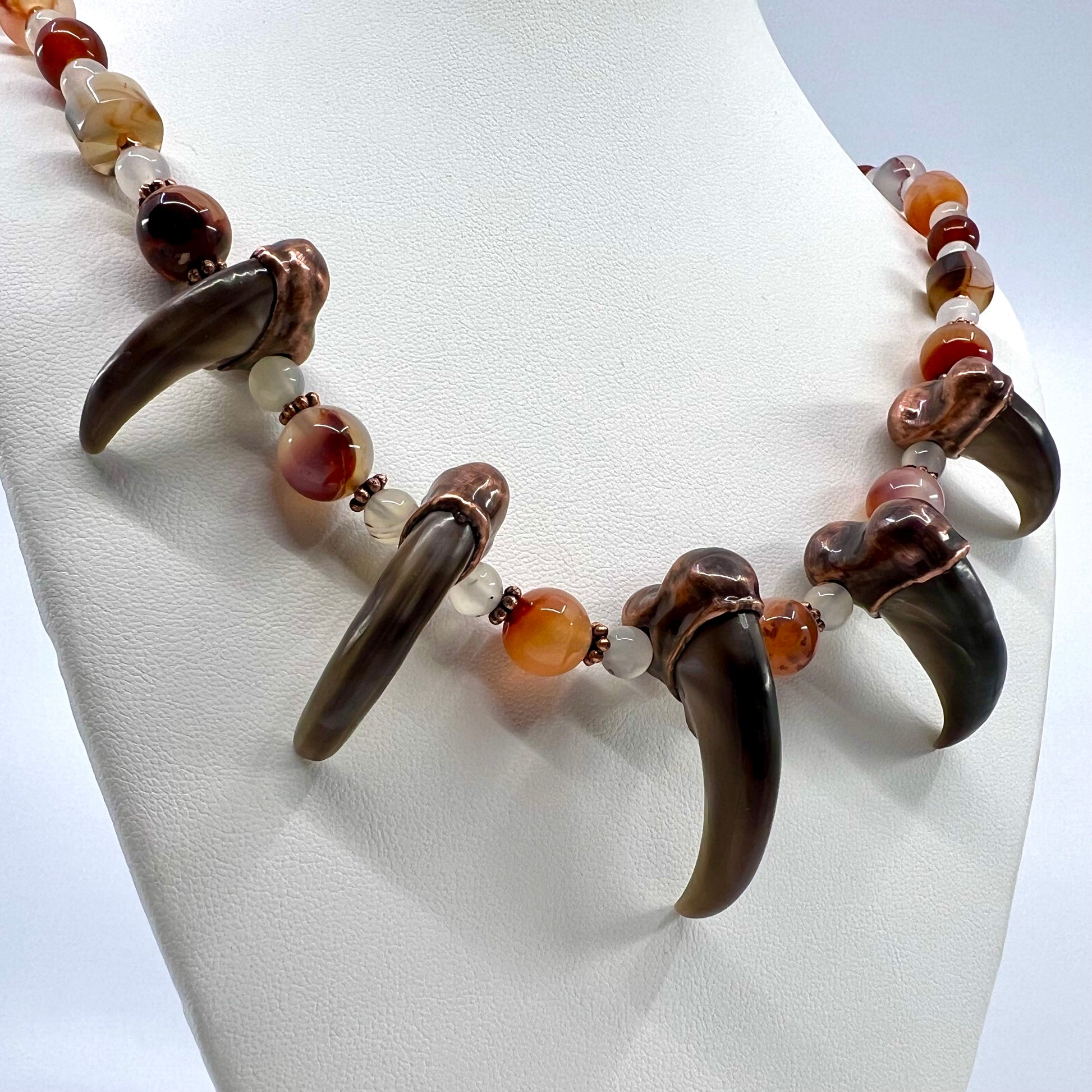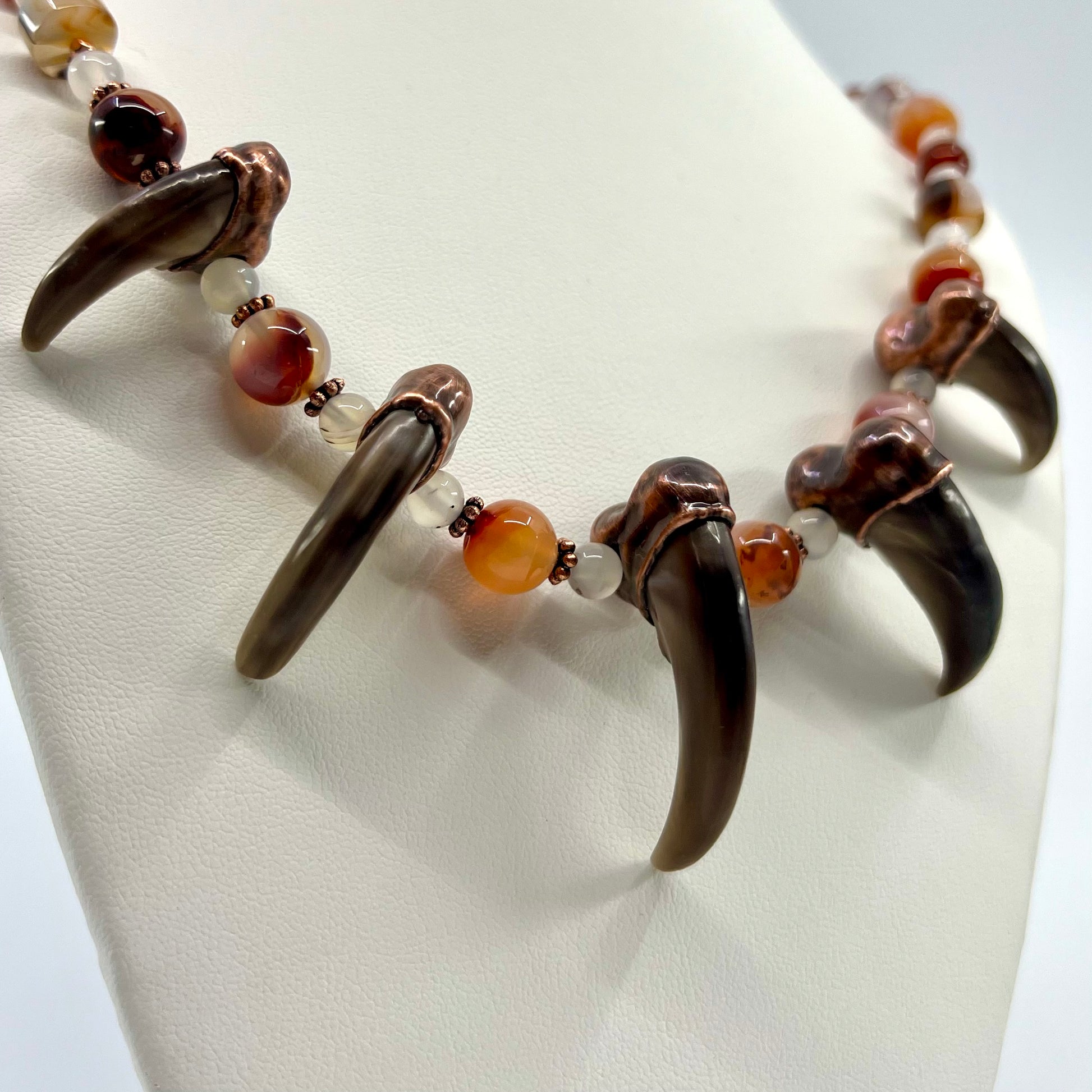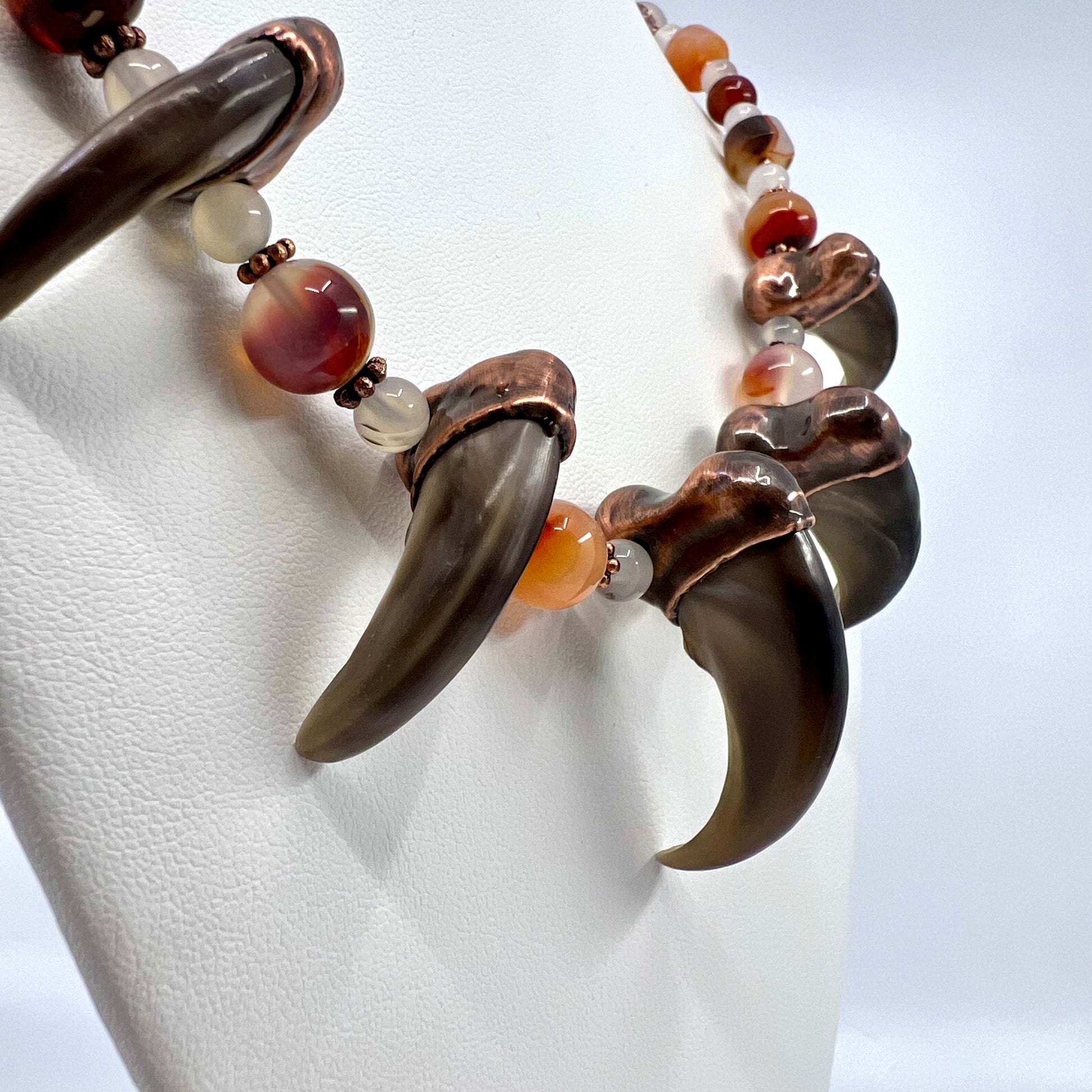 5 copper electroformed bear claws sit on a strand of Montana red dendritic agate (also known as flower agate), carnelian, and copper beads. The claws are not stationary but rather move freely and sit on the chest in a paw like structure. This necklace is intended as a display piece primarily and to be worn on special occasions rather than everyday wear. The 5 claws really emphasize the magnificence of bears and what they are capable of with the swipe of a paw! I find that displaying the claws as a necklace has a different aesthetic to having a hide display with the paws intact as this presentation makes the polished claws the focal point and is more palatable for those who aren’t as accustomed to taxidermy. The necklace is 23 inches long and features an s-hook style clasp. The white leatherette display bust is included.