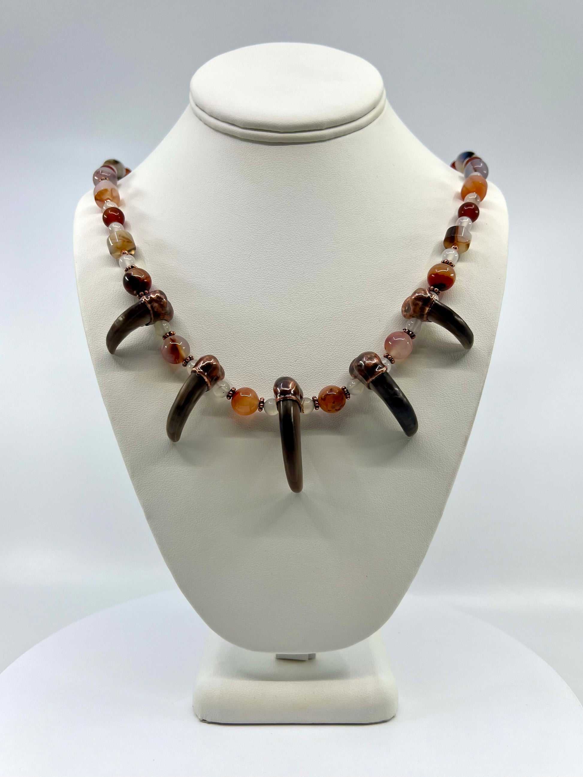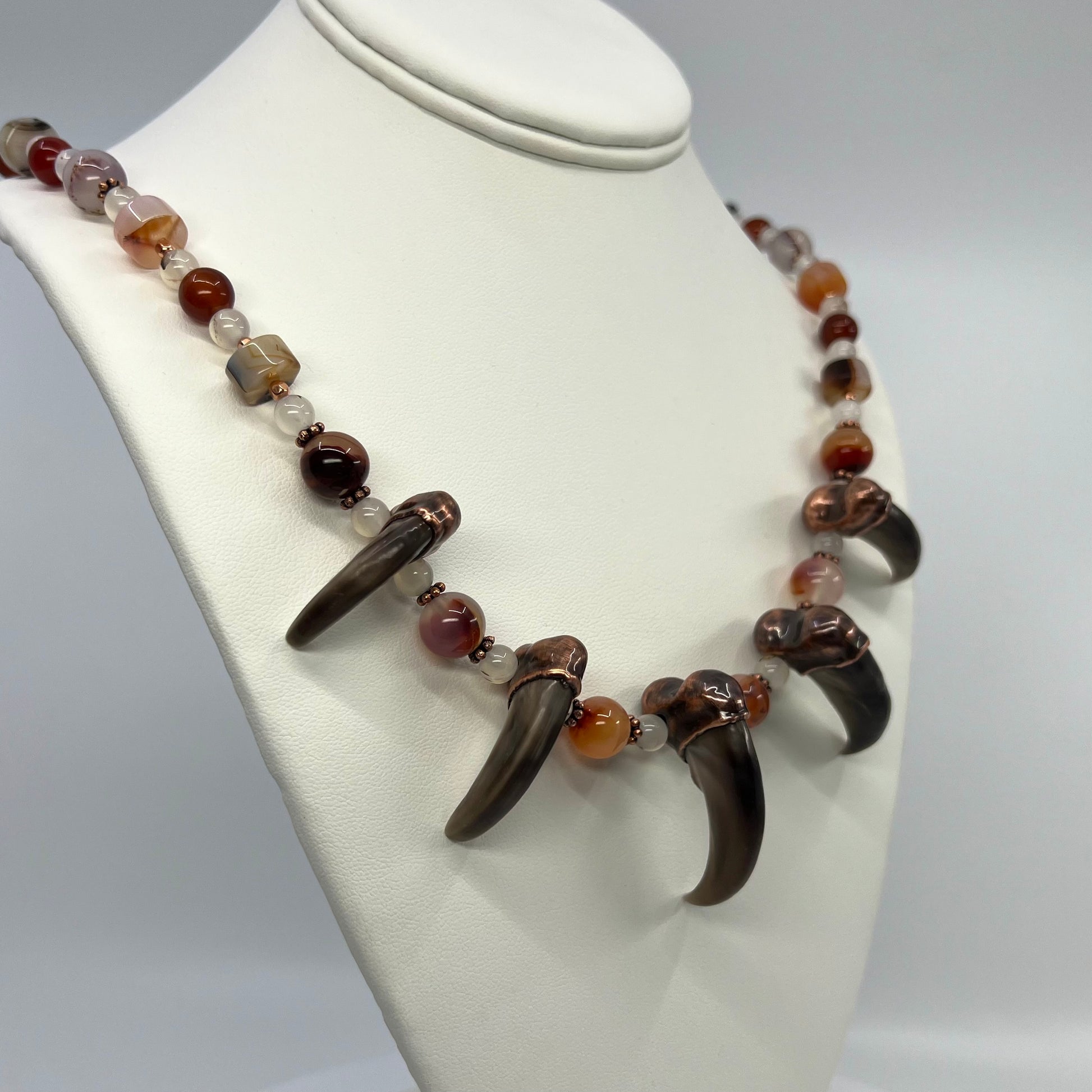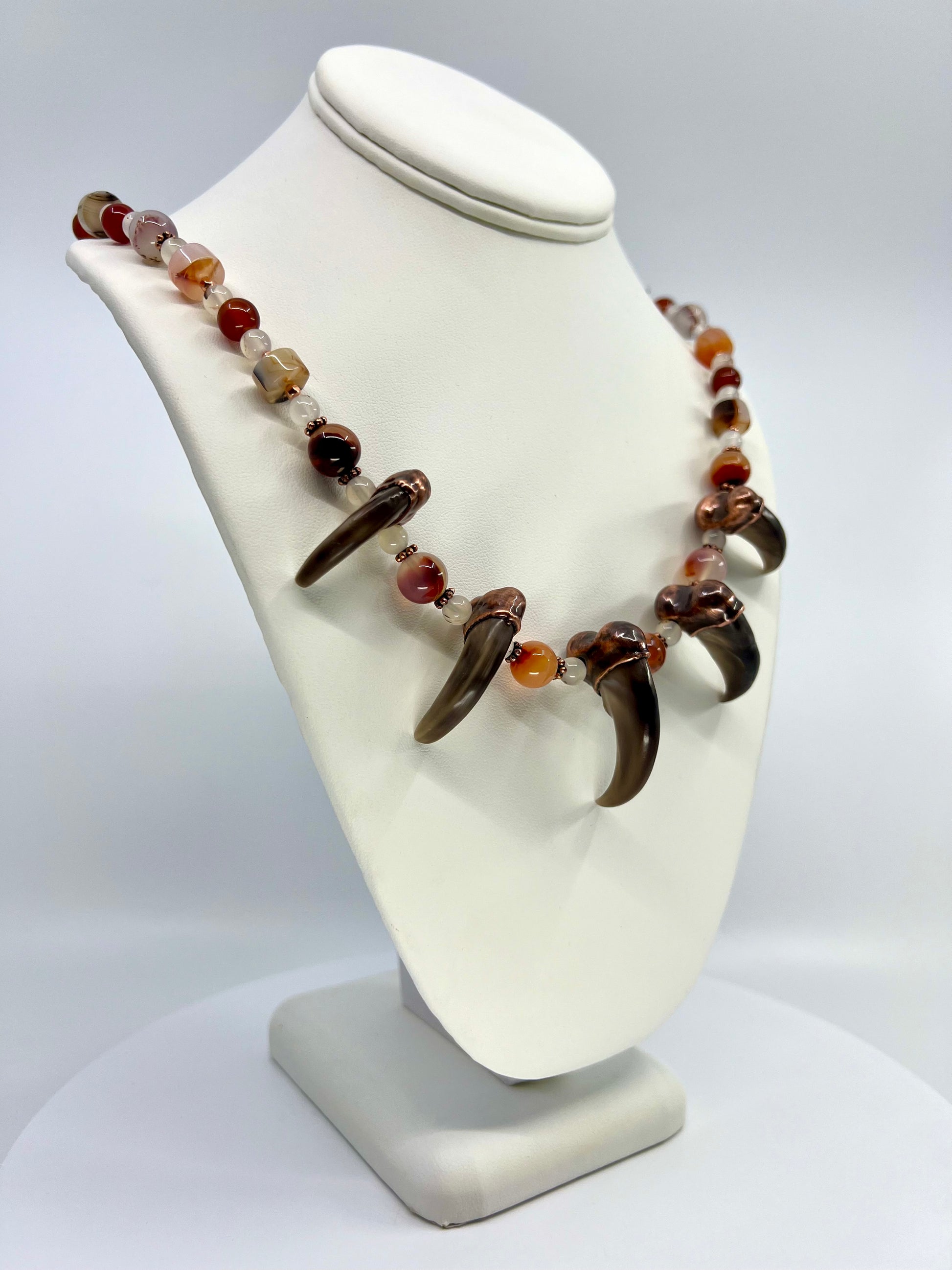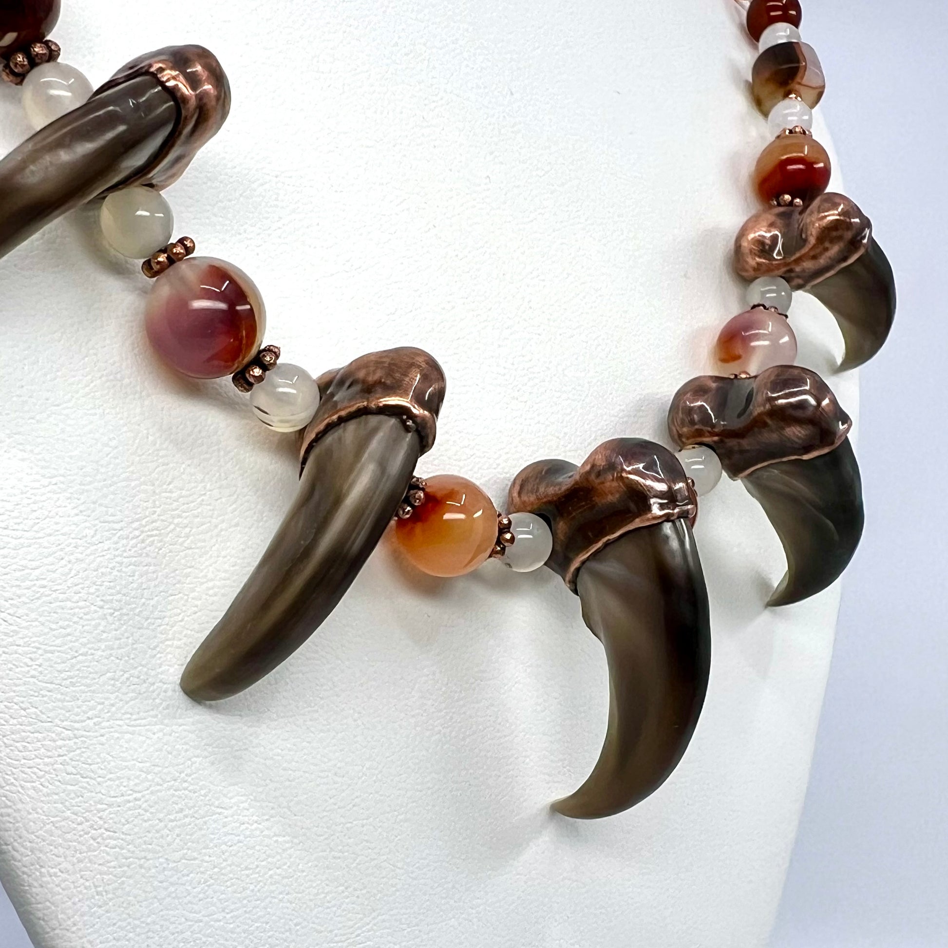 5 copper electroformed bear claws sit on a strand of Montana red dendritic agate (also known as flower agate), carnelian, and copper beads. The claws are not stationary but rather move freely and sit on the chest in a paw like structure. This necklace is intended as a display piece primarily and to be worn on special occasions rather than everyday wear. The 5 claws really emphasize the magnificence of bears and what they are capable of with the swipe of a paw! I find that displaying the claws as a necklace has a different aesthetic to having a hide display with the paws intact as this presentation makes the polished claws the focal point and is more palatable for those who aren’t as accustomed to taxidermy. The necklace is 23 inches long and features an s-hook style clasp. The white leatherette display bust is included.